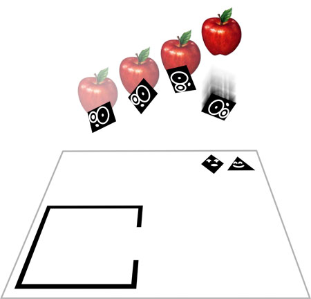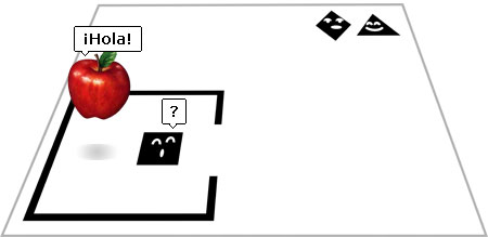 Manzana viendo lo que ocurre procede a hacer otra maniobra con el fin de comunicarse con Cuadrado, posándose sobre el plano justo delante de él. Cuadrado se pega un susto de muerte, ya que de repente una misteriosa forma plana aparece de la nada ante sus ojos.